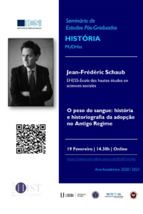 No âmbito do Seminário de Pós-Graduação em História do Instituto de Ciências Sociais da Universidade de Lisboa, Jean-Frédéric Schaub, da EHESS – Ecole des hautes études en sciences sociales, apresentará a conferência intitulada: “O peso do sangue: história e historiografia da adopção no Antigo Regime”, no próximo dia 19 de fevereiro de 2021, às 14h30,