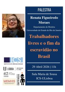 Trabalhadores livres e o fim da escravidão no BrasilRenata Figueiredo Moraes (Departamento de História, Universidade do Estado do Rio de Janeiro) 29 Abril 2026 | 11h00 | Sala Maria de Sousa | ICS-ULisboaResumo: Os estudos sobre os mundos do trabalho, produzidos no Brasil, têm passado por significativas transformações nos últimos anos. Uma das mais significativas diz respeito às investigações que incluem os escravizados como parte fundamental da história do trabalho brasileira. Esta palestra revisita o movimento abolicionista da década de 1880, fundamental para as discussões parlamentares que levaram ao fim da escravidão, abordando como trabalhadores livres aderiram a esse movimento por meio de ações ligadas à educação, associativismo, imprensa e, também, na política.